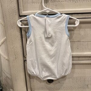 Charming Magnolia baby outfit. Features light blue stripes and a playful green alligator. Ideal for infants.