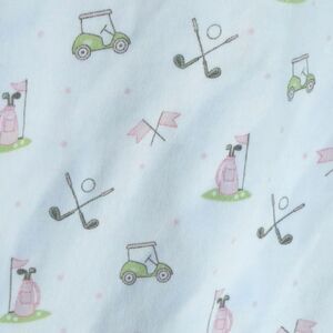 Adorable pattern features golf carts, golf clubs & golf ball, & golf bag.