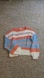 Vibrant sweater with bold stripes. Features cream, orange, and blue hues. Perfect for casual wear. Soft and cozy knit.