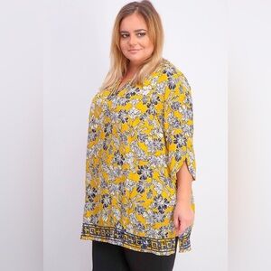 Magnolia Grace Womens Size 1X Mustard & Blue Floral Tunic Top Embroidered Trim