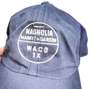 Port Authority Magnolia Market + Garden Waco TX Hat. Navy Blue distressed color with White logo. Baseball style hat with adjustable Velcro closure. Preloved with no flaws. One size. 100% Cotton. Made in Bangladesh.