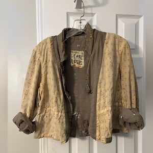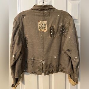Excellent condition - Cropped Kelley Zephyr coat. Distressing, patching, paint/stain and REVERSIBLE. Still sold online. Pit to pit approx 22” - shoulder to hem approx 19”.