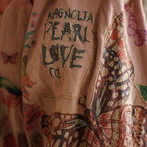 Products from Magnolia Pearl are one size fits most and made with natural fabrics, woven and printed with Love to make them original and full of character. Heavily distressed with intentional rips, sun fading, patching, fraying, and bleaching, these items make them look worn and vintage. Natural color dying creates variations that are one-of-a-kind. Inconsistency is part of the product's originality, character, and hand-made quality. Due to the nature of the materials used, no two items will be 100% identical; this is part of its unique identity and beauty.