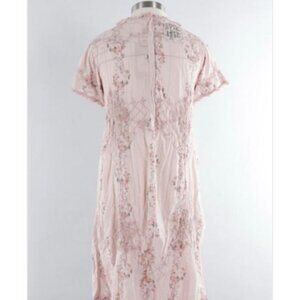 Charming pink midi dress with floral pattern. Features delicate lace details. Short sleeves and relaxed fit.