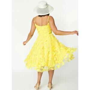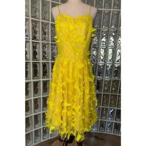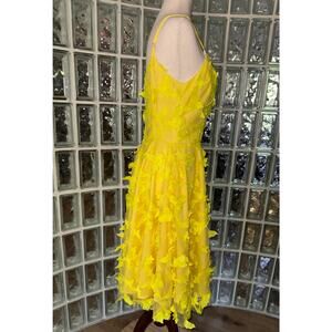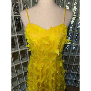 A refreshingly swing dress silhouette, crafted in a bright yellow mesh that dances with 3D butterflies, over a matching yellow lining. Outfitted with adjustable straps, and a back zipper.