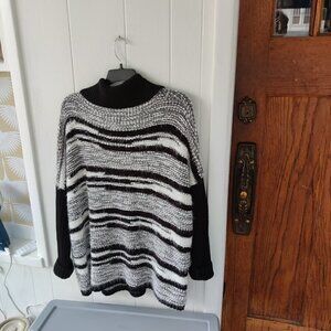Polyester, Acrylic and Cotton Fabric is woven into an abstract Black and White Sweater. Long Sleeved, Mock Turtleneck and Long Length Torso, makes this a feature for all your black and white outfits. Handwashable.