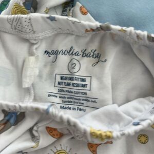 Drift into a world of dreams with Magnolia's pajama sets, featuring a whimsical space-themed pattern. The soft white fabric is accented with light blue cuffs, creating a soothing color palette perfect for a restful night's sleep. Enjoy the playful illustrations of planets, rockets, and celestial wonders that adorn this cozy sleepwear.