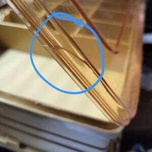 The surface of both lids are scuffed and scratched consistent with age, use and storage. There is a crack (see last pictures for detail) .