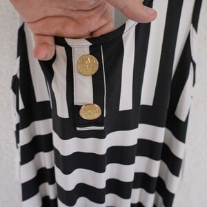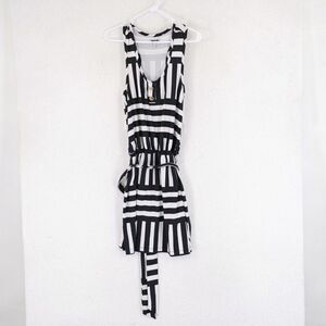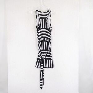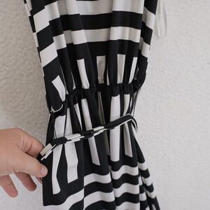 Magpie Blue Small White Striped Plunging Neck Scrunch Belt Dress Sleeveless