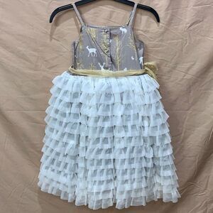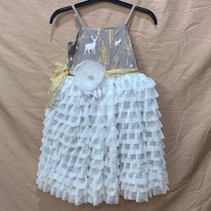 The most stunning out of all Magpie & Mabel dresses (former moxie and mabel), Dahlia dress features full multi-layer skirt with tulle overlay. Delicate tulle flowers and sparkly sequins make this dress a true eye-candy. Comes with a detachable flower clip. From Easter pictures, to birthday parties and everyday play, your girl will look amazing and get a lot of complements in this dress by Magpie & Mabel