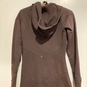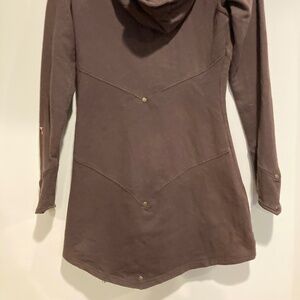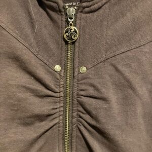 Maha Devi. Organic cotton & hemp tunic hoodie. cool brass accents. Very pixie or elven like. This is a rare piece as Maha Devi doesn't exist anymore. Chocolate brown. XS. Pit to pit = 17". length from shoulder=27".