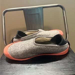 Soft gray slippers with vibrant coral soles. Perfect for everyday comfort and style.