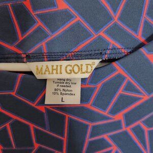 This stunning Mahi Gold dress is perfect for any occasion. The beautiful geometric pattern in shades of blue is sure to turn heads. The dress features a round neckline, short cap sleeves, and a pullover closure for easy wear.