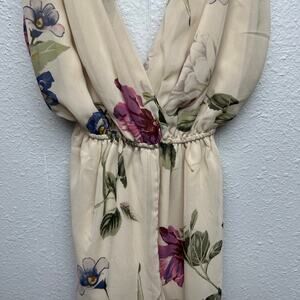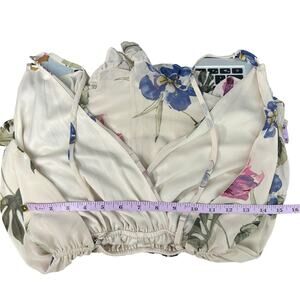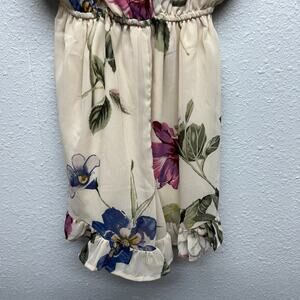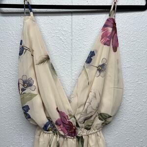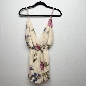 Mahina women's floral romper. Sleeveless. V-neck. Adjustable spaghetti straps. Elastic waist. Ruffle bottom hem. Lined. Lightweight. In good used condition. No stains, tears or holes.
