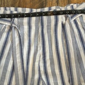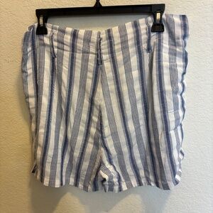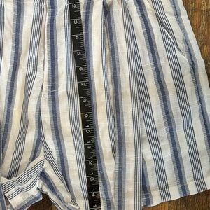 Aloha = 100% cotton with 100% rayon lining, blue small and large stripped shorts with a gathered waist if you choose. I included the last photo to show how the shorts look when gathered at the top (they are similar shorts but not the same design). These are the perfect shorts for summer, along the beach, a walk through the park, running an errand. Comfortable and cool. Great Condition