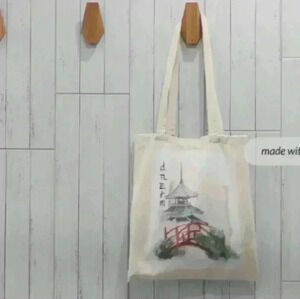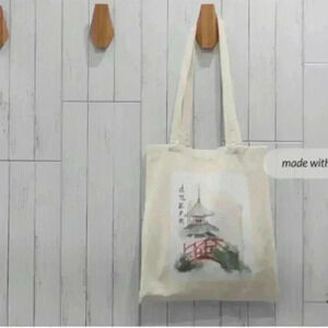 Mahjong inspired print of a bridge and tower recycled canvas tote bag