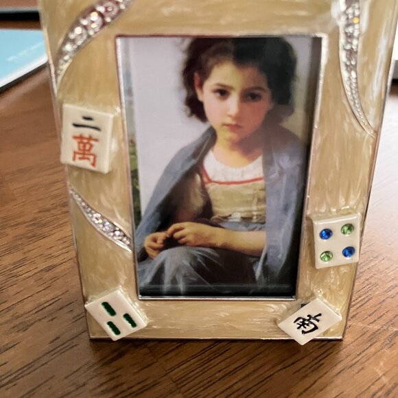 Add a touch of vintage charm and cultural flair to your space with this Mahjong-themed decorative photo frame. The ornate border features embedded rhinestones and authentic Mahjong tile motifs, including Chinese characters, colored dots, and bamboo symbols. Perfect for collectors, Mahjong enthusiasts, or anyone who loves eclectic, statement décor.