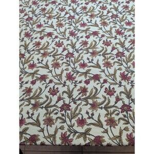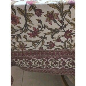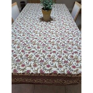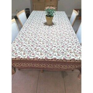 This Mahogany/ Gold Indian Block Print 100% Cotton Large Tablecloth features a bordered floral pattern in a vibrant multicolor design. Made in India, this rectangular tablecloth measures 80" x 57" and is machine washable for easy care. Perfect for all occasions, this unique piece adds a touch of tradition and elegance to any dining table setting.