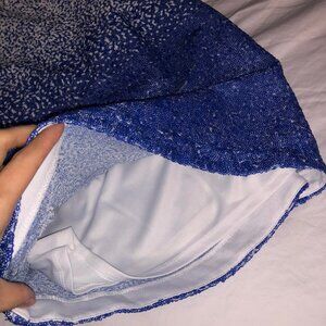 The dress is a sleeveless, white and blue ombre sequin dress. The sequins cover the entire dress, front and back, and create an ombre effect that transitions from white at the top to blue at the bottom.