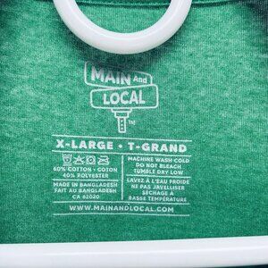 This Maid And Local T-Shirt in size X-Large features a graphic print of the Life Of The Paddy Green design. The shirt has short sleeves, a crew neckline, and is made of a blend of polyester and cotton materials. It is machine washable and suitable for all seasons. The shirt's green color and logo accents make it a great addition to any casual outfit. It is perfect for summer, fall, or spring. This T-shirt is not handmade and is not a vintage item. It is a regular fit for men and was manufactured in Bangladesh.