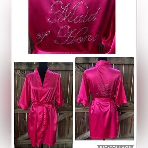 David’s Bridal Maid of Honor MOH Rhinestone Dark Pink Satin Robe & Removable Sash Belt. 3/4 Sleeves, Inside Tie Closure, Luxurious Satin Robe "Maid of Honor" in Sparkling Rhinestone Script In Back.