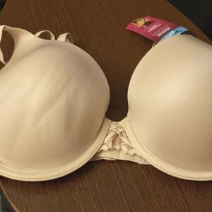 This no-poke underwire push-up bra delivers the shapely push-up support you want without the poking or pinching you don't. It's all done with our cushioned Dreamwire™ technology that encases the underwires between plush foam and soft outer fabric for unmatched underwire comfort. Satiny cups provide no-show smoothness under tees and other knits, with a touch of feminine lace at the center. Plus, it offers convertible convenience, transforming from traditional straight straps to crisscross wear in an instant.