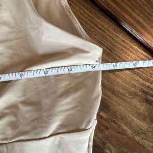 This Maidenform bodysuit in a warm tan hue features a sleek V-neckline and a form-fitting silhouette. The wide, adjustable shoulder straps and seamed waist provide a flattering fit, making it a versatile addition to any wardrobe. Crafted from stretchy material, it ensures comfort and style for any occasion. Excellent preowned condition, smoke free home.