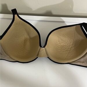 Very pretty bra in a two tone layered fabric. The black lace, straps are on the outside and an off white fabric is under the lace. Adjustable straps. Very nice bra. No visible flaws. Any questions please ask. Will answer questions as soon as possible. N