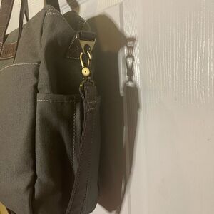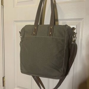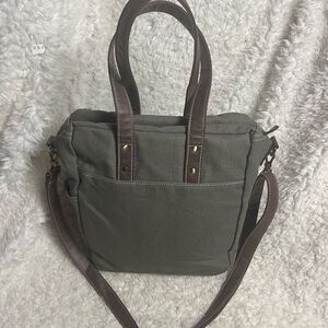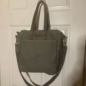 Maika Recycled commuter canvas army Green tote /shoulder Bag Brown straps.Front pocket,top zipper pocket the inside lining has a padded laptop compartment.Pre owned in good used condition a small faded spot in the front part of the bag. see all pictures any questions please message. Z3