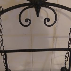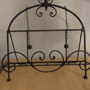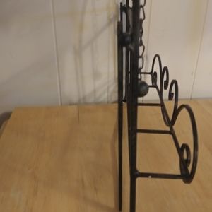 Black wrought iron mail holder it can be hung up on the wall or I can stand up when I stand the balls that are hanging down will keep the letters in place nice little house hold item