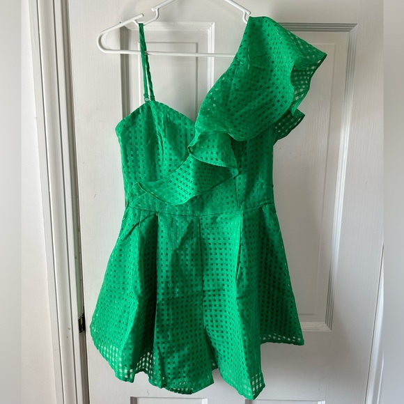 Bright green one-shoulder romper by Main Strip. Features ruffled neckline and fitted waist. Playful eyelet fabric with flared shorts. Lightweight and feminine style.