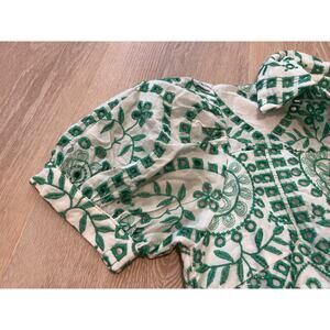 Main Strip NWT Eyelet Lace Puff Sleeve Romper Green White Boho Tropical Medium