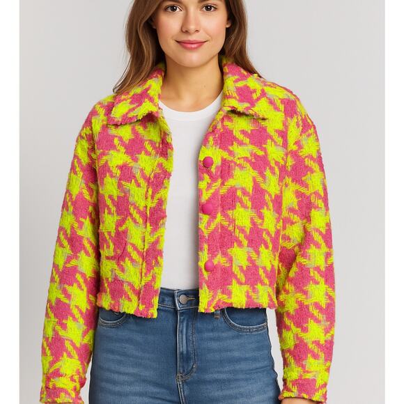 Main Strip Tweed Jacket Women S Neon Yellow Pink Houndstooth Cropped Maximalist