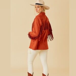 This Western Fringe Suede Jacket in burnt orange offers a vintage yet trendy look.