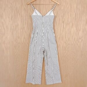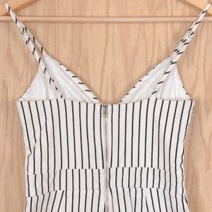 Brand New Without Tags. Get ready for your next vacation and pack this jumpsuit in your suitcase! The perfect black and white striped jumpsuit for a boat ride, dinner date, walk on the beach, birthday party or simply just enjoying yourself! Fitted with an adorable bow tie detailing in the front and adjustable straps to customize your length.