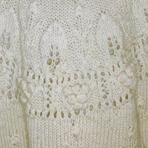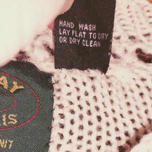 Hand-washable - follow directions! 100% wool sweater. Lovely addition that will last a lift-time with proper care. Fun pattern - it used to be called Pineapple print when my grandma made it. In excellent condition. I am no longer this size and am cleaning out what no longer fits me. Great sweater - keeps you really warm.