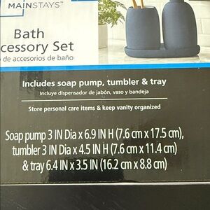 Mainstays 3 piece Bath Accessory Set: soap pump, tumbler, and tray. Sleek design. Perfect for any bathroom.