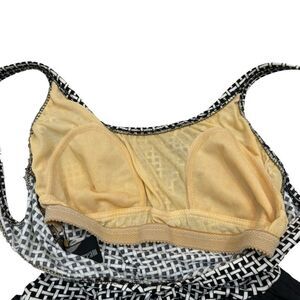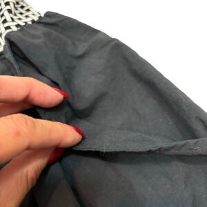Black and white basket weave print on top and nylon shorts on bottom