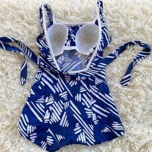 Blue & white patterned one piece bathing suit with built in bra padding and belted. In good pre-owned condition.