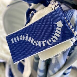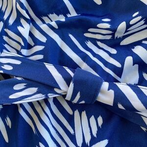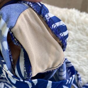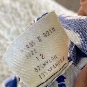 Blue & white patterned one piece bathing suit with built in bra padding and belted. In good pre-owned condition.