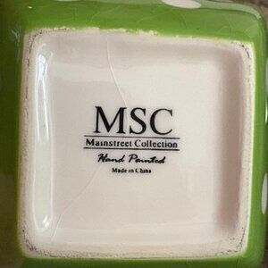 Super cute, pre-loved hand-painted strawberry dish by Mainstreet Collection. Made of weighty ceramic, this pretty, colorful and quality design features black and white stripes, key lime green and white polka dots on the outside, and red strawberries on the inside. It is about 5 inches x 5 inches and 3 inches deep.