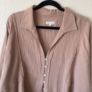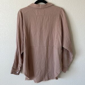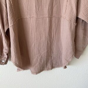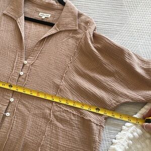 Tags: bohemian, boho, gauzy, cotton, shirt, top, pop over, lightweight, breathable, button front, shacket, boxy, oversized, casual, camel, brown, tan, minimalist, capsule wardrobe, closet staple, beachy, chic, easy, breathable, breezy, throw over, fall