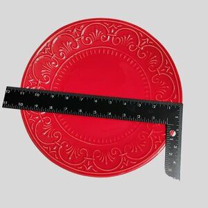Large Italian-made dinner plate, combines functionality with an elegant design. Its vibrant red hue and embossed pattern offer sophistication to table settings. Discontinued pattern.