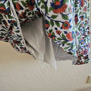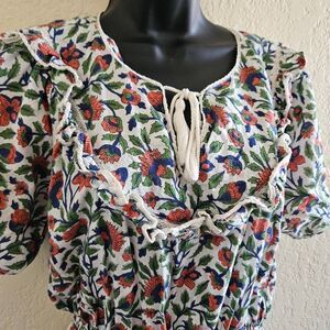 This is a mini dress by Maisie.  It is white with orange, green, and blue tone floral print.  There is a tie at the neckline and an elastic waist.  This dress has short sleeves accented with buttons and a solid white lining underneath.
