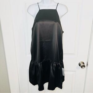 Maisie Monti Tiered Slip Dress Satin Square Neck Drop Waist LBD Black Size Medium. Sleeveless. Drop Waist. Tiered ruffle. Flared at bottom. Spaghetti Straps. Mini length. Lined. NWT