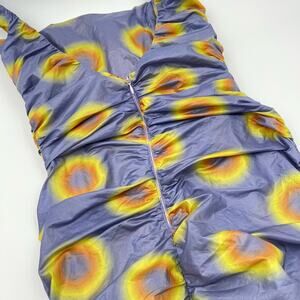 Maisie Wilen | Lady Miss Purple Yellow Ruched Low Back Polka Dot Midi Dress M