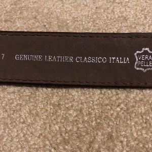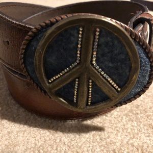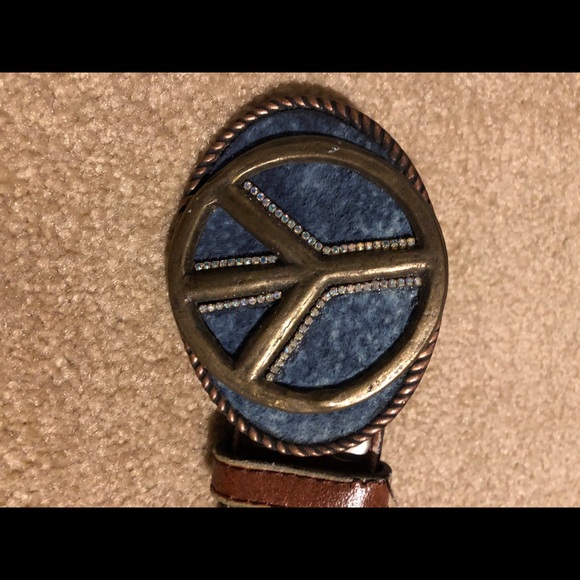 Suede denim with brass and rhinestone peace sign brown leather belt
