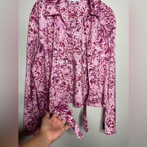 Maison D’Amelie Anthropologie satin purple print top with bell sleeves. No visible flaws, EUC.