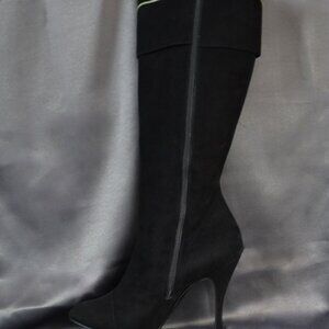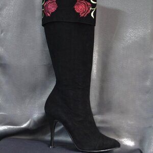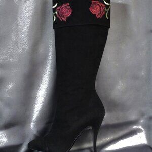 TITLE: Maison Ernest Paris Boots Size 10 EU 41 Black Suede w Red Embroidered Roses 4.5 Inch Heel 19 Inches Tall Made in Italy