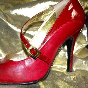 CONDITION - Very good condition – with box but not the original box - made by hand in Italy - designed by Ernest of Maison Ernest in Paris whose design specialty is high heels (talons hauts) - what makes these shoes interesting and beautiful is the strap and buckle and also the red patent leather on the back and sides of the heel and on the stiletto heels- these were owned by a collector of mostly high-heel shoes who ordered them directly from Ernest in Paris - these have normal wear on the soles - and slight wear on the gold leather insoles - they do not come in the original box - the red calf leather has a mottled look to it - the shoes were part of a collection of over 500 pairs of shoes - five-inch stiletto heels - please scroll down for more information.